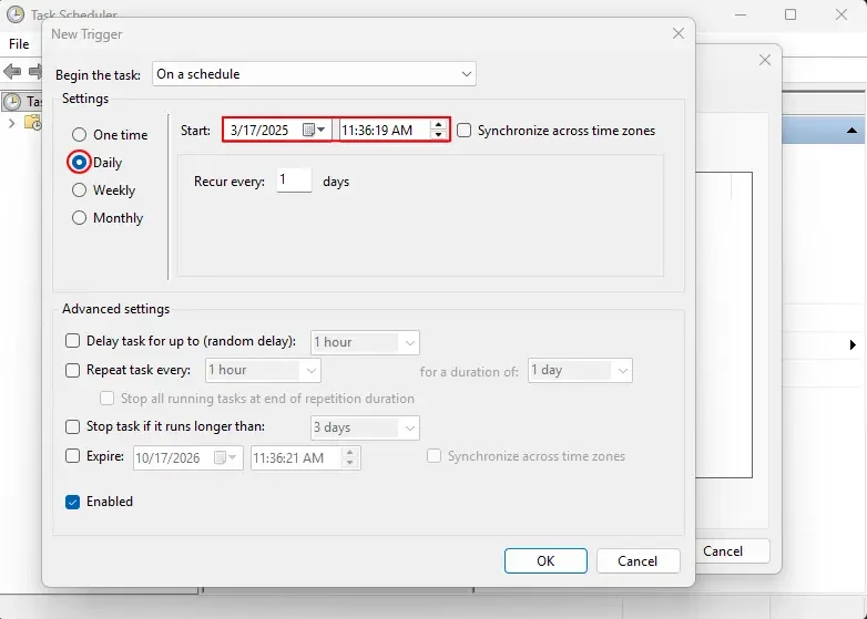 4. In the “Trigger” tab, choose “Daily” and set a Start Time.