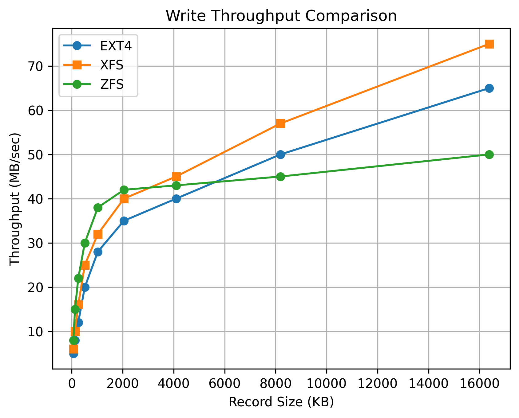 - ext4 and XFS outperform ZFS in throughput
