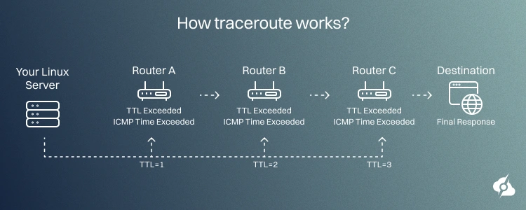 Traceroute shows the network path (hops) between your Linux server and a destination host, along with the latency at each hop. It’s a quick way to pinpoint where slowness, routing breaks, or filtering begins, before you dig deeper with packet captures or provider tickets.