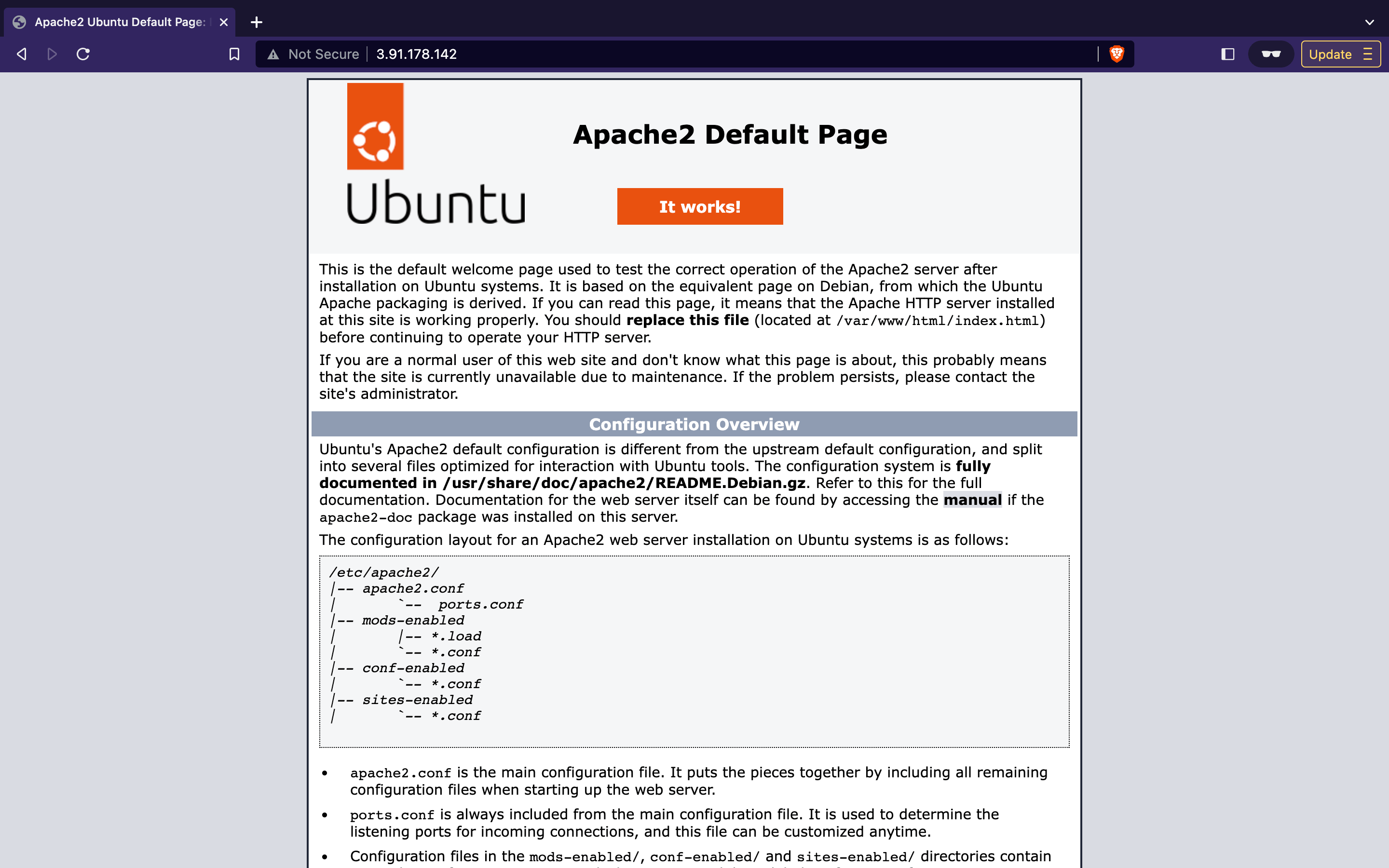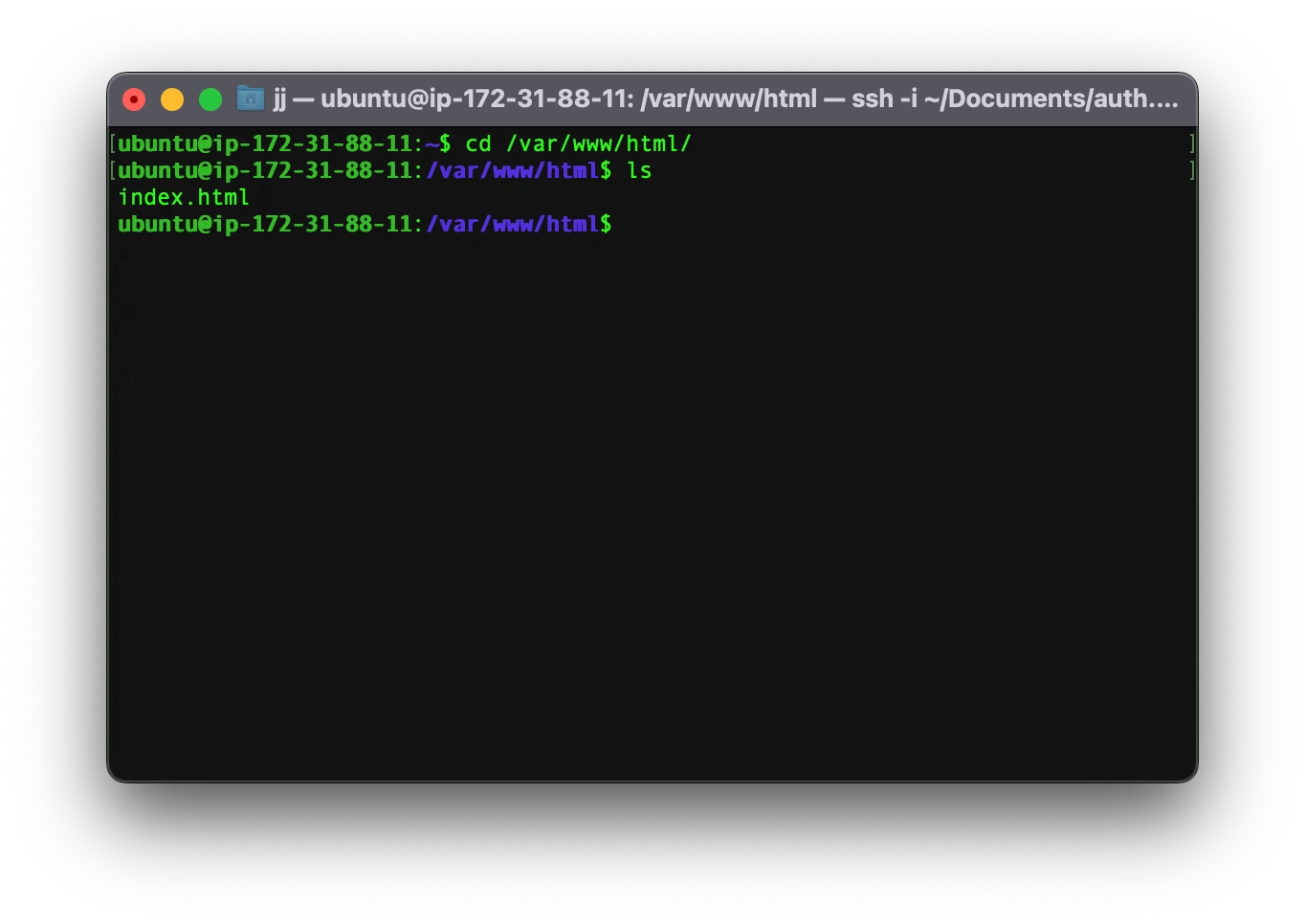 As you can see, we have only index.html in the directory which is the default file. To check this file, write your IP address in a web browser and you shall see this.