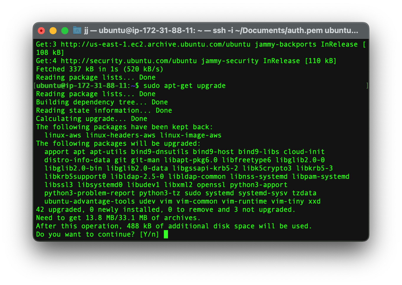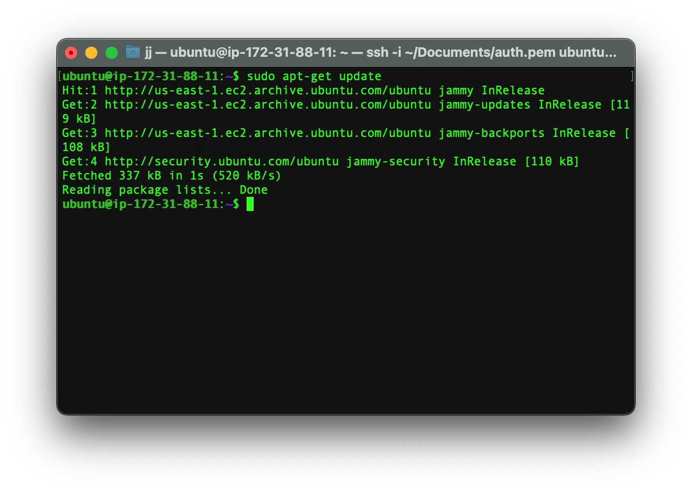 ssh -i [.PEM_FILES_LOCATION] [USERNAME]@[IP_ADDRESS]The first parameter is your .pem file’s location and the second parameter is your server’s IP address.