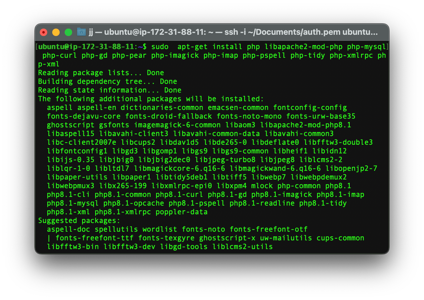sudo apt-get install php libapache2-mod-php php-mysql php-curl php-gd php-pear php-imagick php-imap php-pspell php-tidy php-xmlrpc php-xml