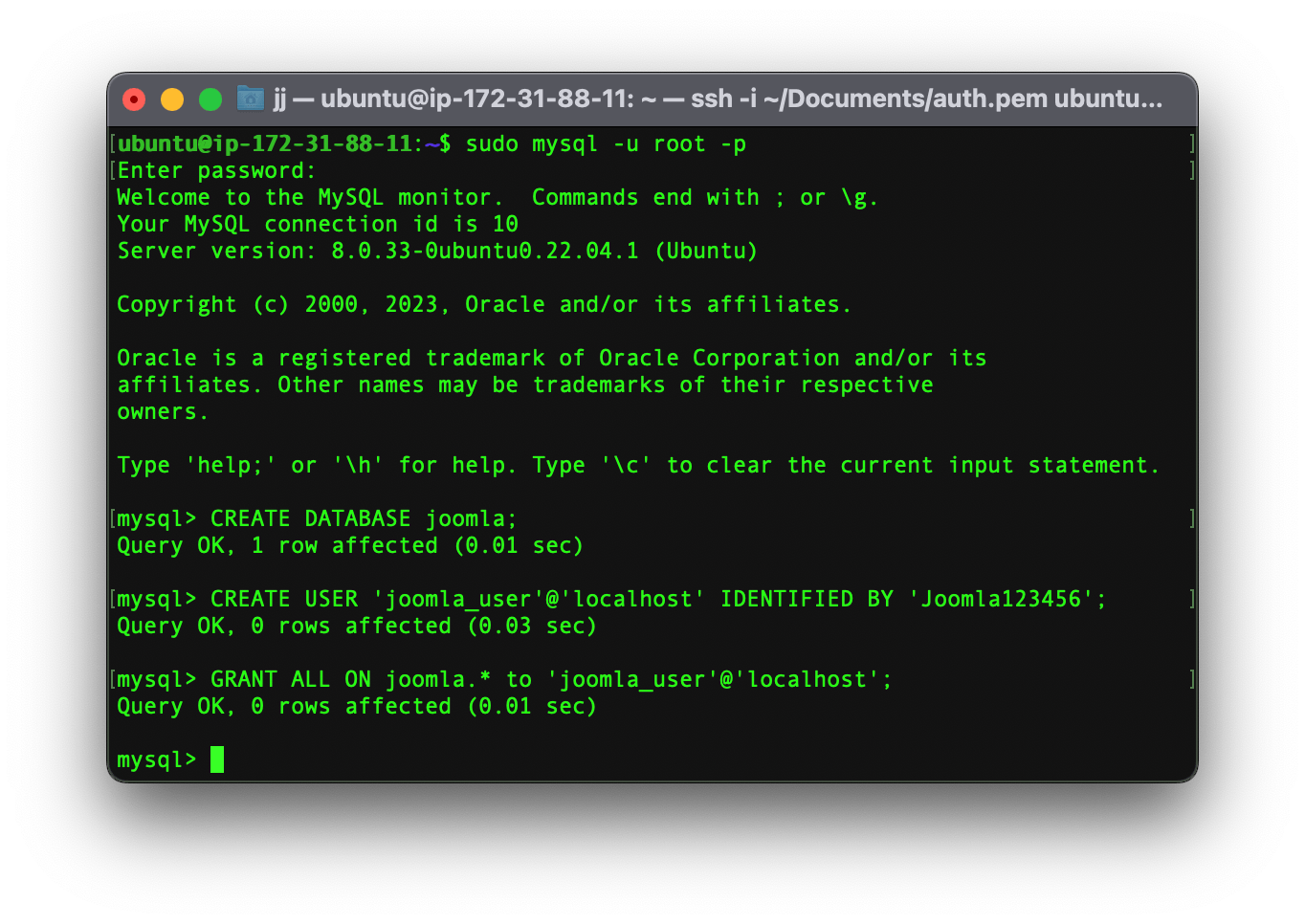 Now in order that Joomla may operate correctly we need to grant Joomla permission by typing these commands: